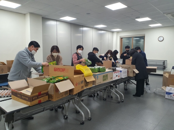 | 김천시 율곡동행정복지센터 김종현 동장과 직원들은 설을 앞두고 지난 1월 16일 독거 어르신, 장애인, 복지사각지대 25가구에 찹쌀, 미역, 과일, 계란 등 생필품 10종을 담은 박스를 전달했다.