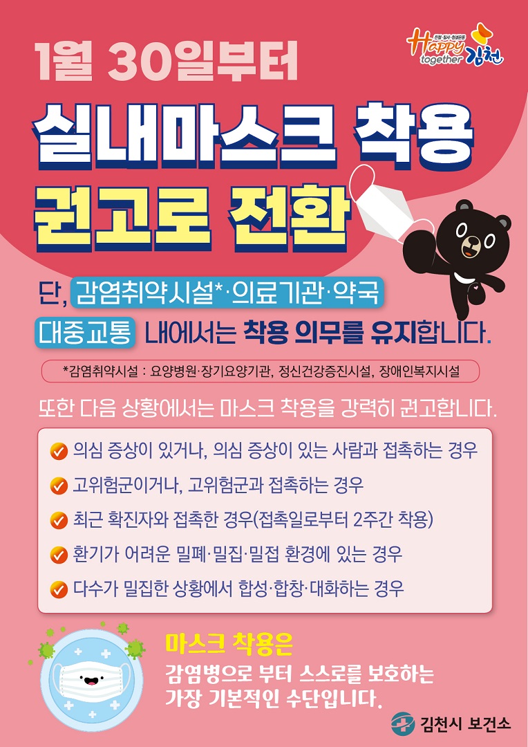 | 김천시는 최근 코로나19의 국내 유행 감소세, 위중증 사망자 감소, 안정적인 의료대응 역량 등을 고려해 결정한 중앙재난안전대책본부(중대본) 방침에 따라 1월 30일부터 실내 마스크 착용의무를 권고로 전환한다.