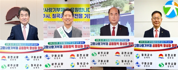 경북 중서부 경제생활권을 이루는 김천, 구미, 상주시와 칠곡군은 상호 유기적인 협력체계를 구축하여 ‘고향사랑기부제’의 활성화와 지역경제 발전을 함께 이루어 나가자는 뜻에서 상호 협약을 체결했다.