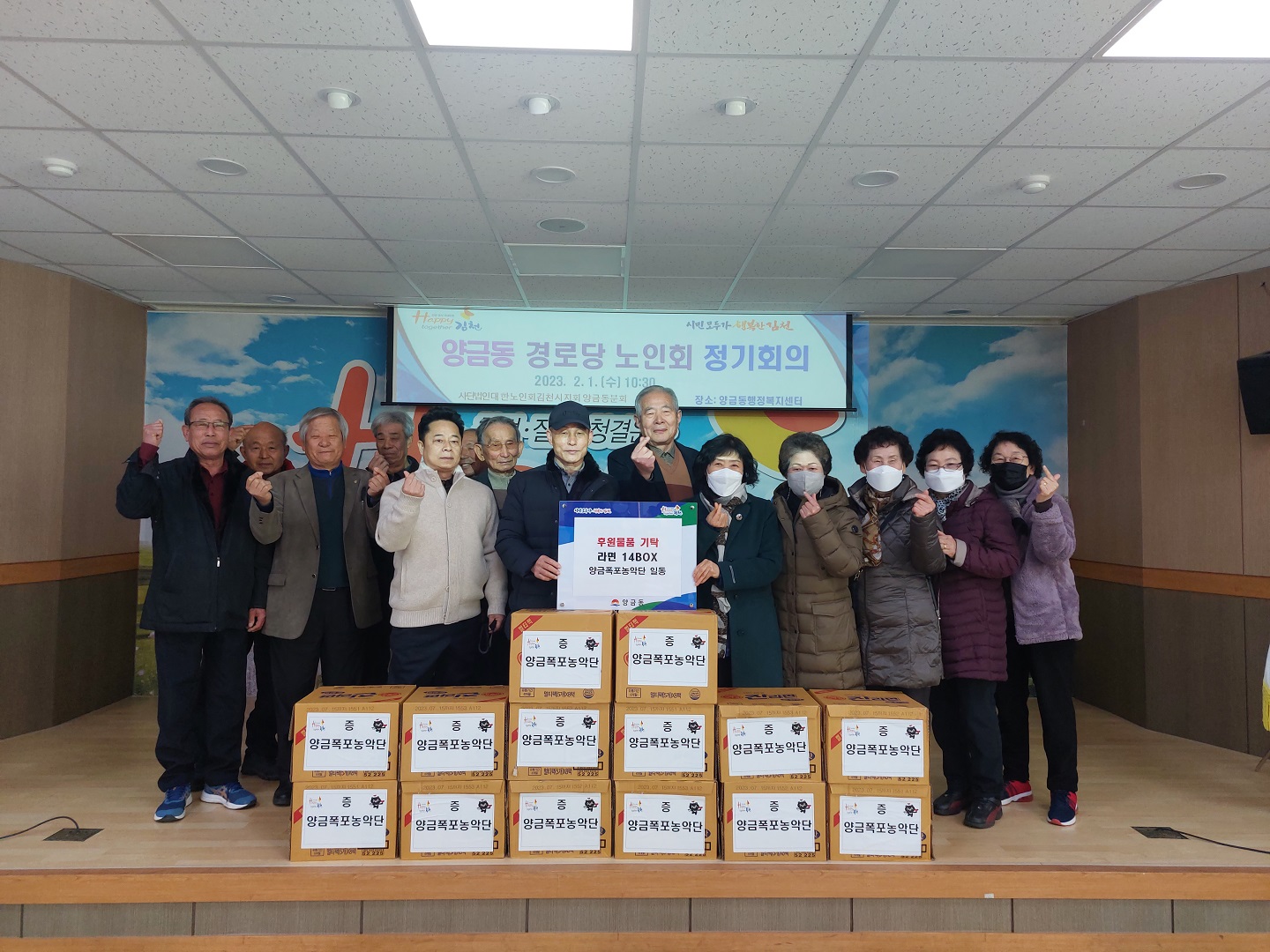 | 김천시 양금동 양금폭포농악단(단장 백순식)은 2월 1일 관내 경로당 어르신들에게 라면 14박스를 기탁했다. 새해를 맞아 단원들이 십시일반 모은 정성으로 이웃돕기에 동참하게 되었으며, 관내 경로당 14개소에 전달할 예정이다.