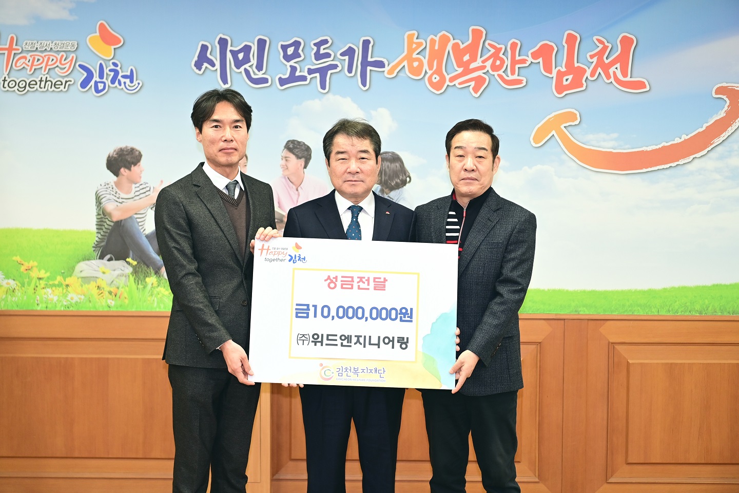 | 김천복지재단(이사장 김충섭)에서는 2월 3일 ㈜위드엔지니어링으로부터 1천만원의 성금을 전달받았다고 밝혔다.