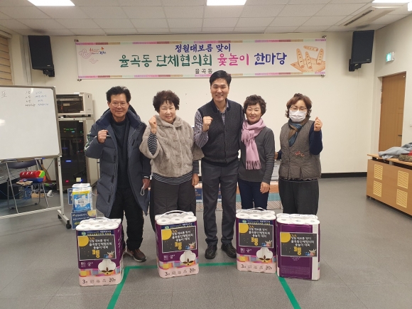| 이날 행사는 율곡동 15개 관변단체가 주관하여 실시했으며, 회원 40여명이 자리해 휴지·각티슈·세제·키친타올 등 50만원 상당의 경품과 함께 다과를 들며 친목을 다졌다. 경기결과 우승 노인회, 준우승 새마을지도자협의회, 3위 농악단, 패자부활전 우승은 행정복지센터로 돌아갔다.
