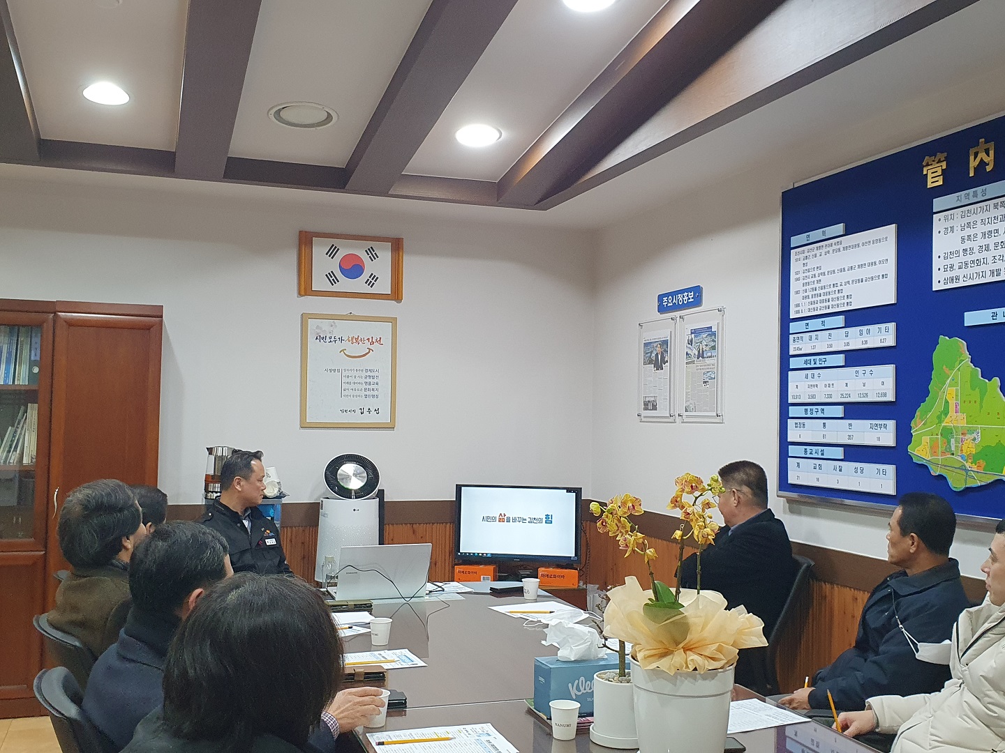 김해문 대신동장은 김천시 주요 사업 추진현황을 PPT 자료로 직접 제작하여 단체장들에게 주요 사업 전반에 대해 설명하는 시간을 가져 각 단체장들이 시정을 이해하는데 도움이 되었으며 큰 관심과 호응을 얻었다. “앞으로 언제든 궁금하신 사항이나 건의 사항이 있으면 말씀해주시고, 김천시 주요 사업 전반에 각 단체 회원 분들께 널리 알려 시민들의 많은 관심과 협조를 바란다.”고 강조했다. |