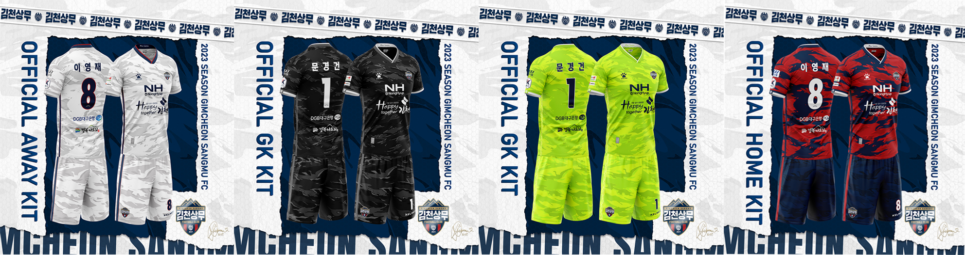 김천상무프로축구단이 2월 10일, 2023 시즌 유니폼을 공개했다. K리그 팀들 중 유일한 군 팀인 김천상무는 국군 대표 패턴인 ‘카모플라쥬(Camoflauge)’ 패턴을 구단 공식 색상인 빨강과 네이비를 활용해 유니폼 전체에 입혔다. 카모플라쥬 패턴은 김천상무가 K리그2 우승을 차지했던 2021 시즌과 동일한 컨셉으로 우승의 영광을 다시 한 번 가져오겠다는 굳은 결의의 표현이기도 하다.
