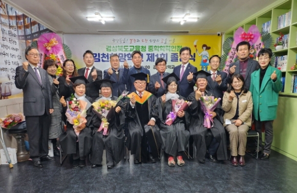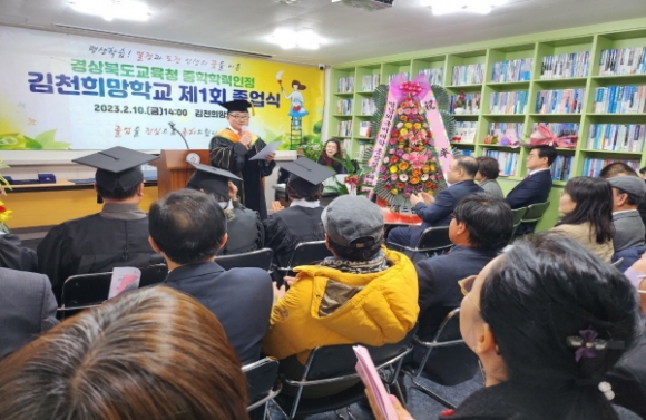 |  | | | ⓒ 김천내일신문 | | 김천희망학교(교장 서명환)은 지난2월 10일 경상북도교육청지정 성인 학력인정 문해교육 중학교 과정‘김천희망학교’ 첫 졸업식을 가졌다.