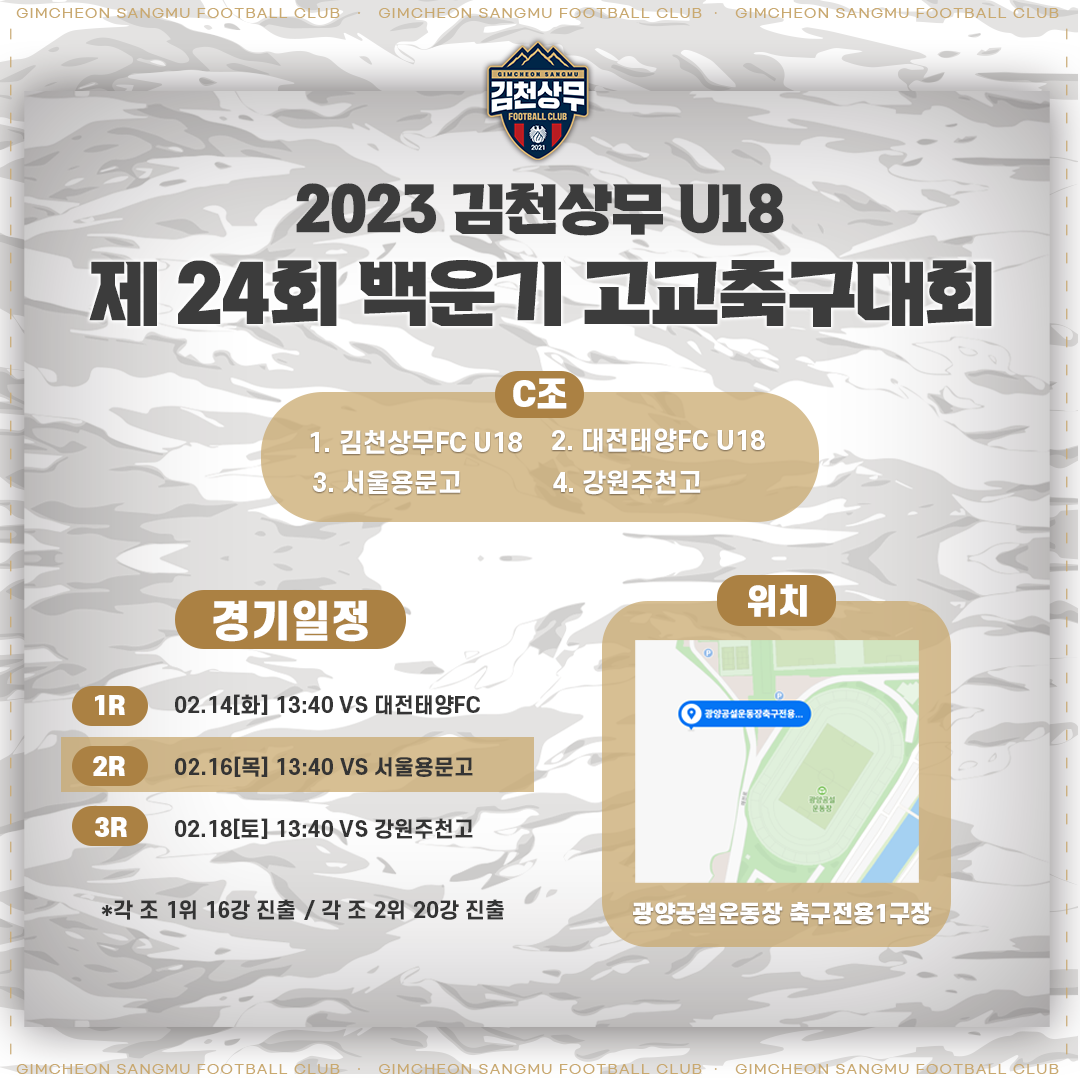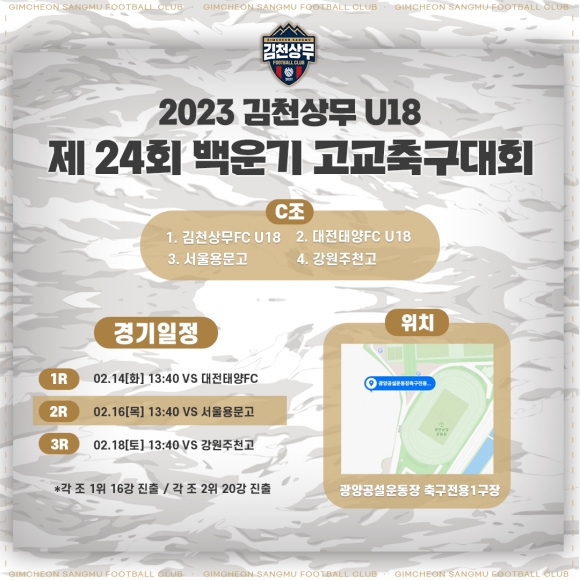 | 김천상무 U18 팀이 오는 2월 14일부터 전남 광양에서 열리는 ‘제24회 백운기 고교축구대회’에 참가한다. 백운기 고교축구대회 첫 출전인 김천상무 U18팀의 목표는 4강 진출이다.