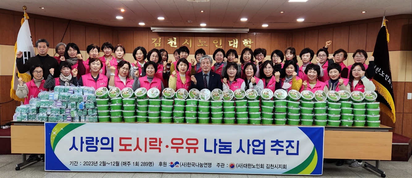 | 김천시 노인회지회 (회장 이부화)에서는 지난해에 이어 올해도 (사)한국나눔 봉사연맹 (사무총장 안천웅)의 후원을 받아 경로당행복도우미 사업과 병행하여 지역 어르신 중 독거·복지 사각지대에 계신 분들을 발굴하여 사랑의 도시락·우유 나눔 사업을 추진하여 훈훈한 사회 분위기 조성과 노인복지 증진에 큰 귀감이 되고 있다
