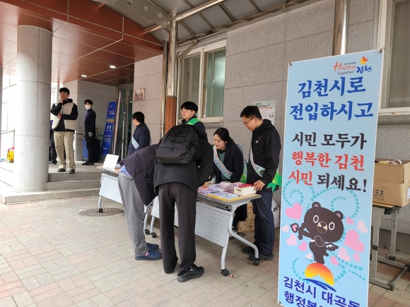이 날은 김천고등학교 신입생들의 기숙사 입소일로, 아직은 김천지역이 낯설어 행정복지센터 방문이 쉽지 않은 타지역 학생을 대상으로 ‘찾아가는 전입창구’를 기숙사 입구에 설치 운영함으로서 행복도시 김천홍보와 더불어 현장에서 전입신고 행정서비스를 제공하여 인구전입 활동에 박차를 가했다.