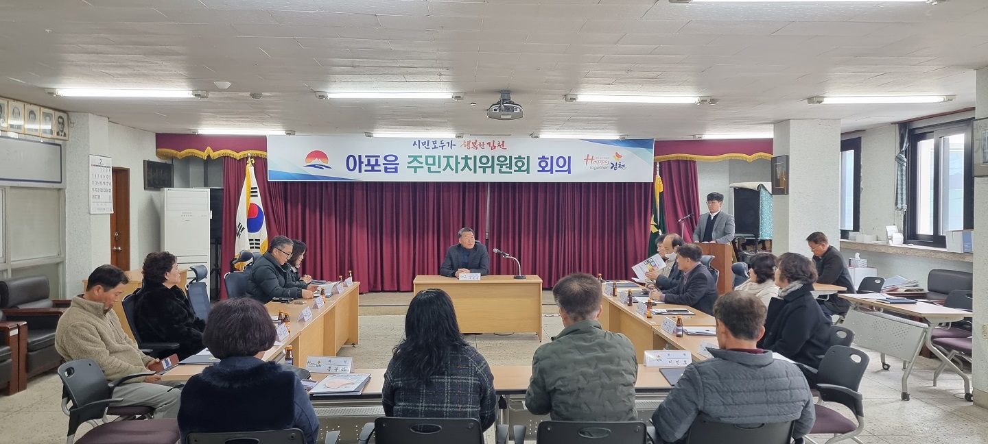 이날 회의는 2023년부터 임기(2년)를 시작하는 김천시 주민자치위원회 3기 위원(신임 6명, 연임 11명)과 함께 진행되었으며, 신임 위원의 위촉장 수여와 아포읍장(김현인)의 인사말 및 읍 전달사항(고향사랑기부제 등) 순으로 회의가 진행되었으며, 아울러 3기 신임 임원진이 선출됐다.