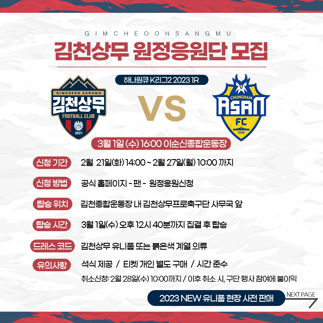 김천상무프로축구단이 3월 1일 오후 4시, 이순신종합운동장에서 충남아산FC와 ‘하나원큐 K리그2 2023’ 1R 원정 경기를 치른다. 김천상무는 K리그1 승격을 향한 첫 여정의 시작을 팬들과 함께할 예정이다. 김천상무는 충남아산 원정 개막전에서 선수들에게 힘을 불어넣을 원정응원단을 모집한다. 모집 기간은 21일 오후 2시부터 27일 오전 10시까지다.
