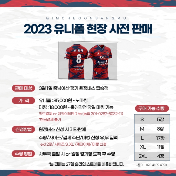 원정버스 탑승객 대상으로는 홈 유니폼 현장 사전 판매를 진행한다. 사이즈 별 구매 가능 수량이 정해져있으며, 선착순으로 마감된다. S사이즈 5장, M사이즈 8장, L사이즈 17장, XL사이즈 11장, 2XL사이즈 4장이다. 유니폼 가격은 85,000원이며 마킹비 18,000원은 별도다. 유니폼 구매 희망자는 원정버스 신청 시, 기타 란에 수량/사이즈/결제수단/마킹유·무를 입력하면 된다. 아산전 원정 경기 당일 수령 가능한 유니폼은 노마킹 유니폼이며 마킹은 4월 2일 홈 개막전 당일 MD샵에서 가능하다.