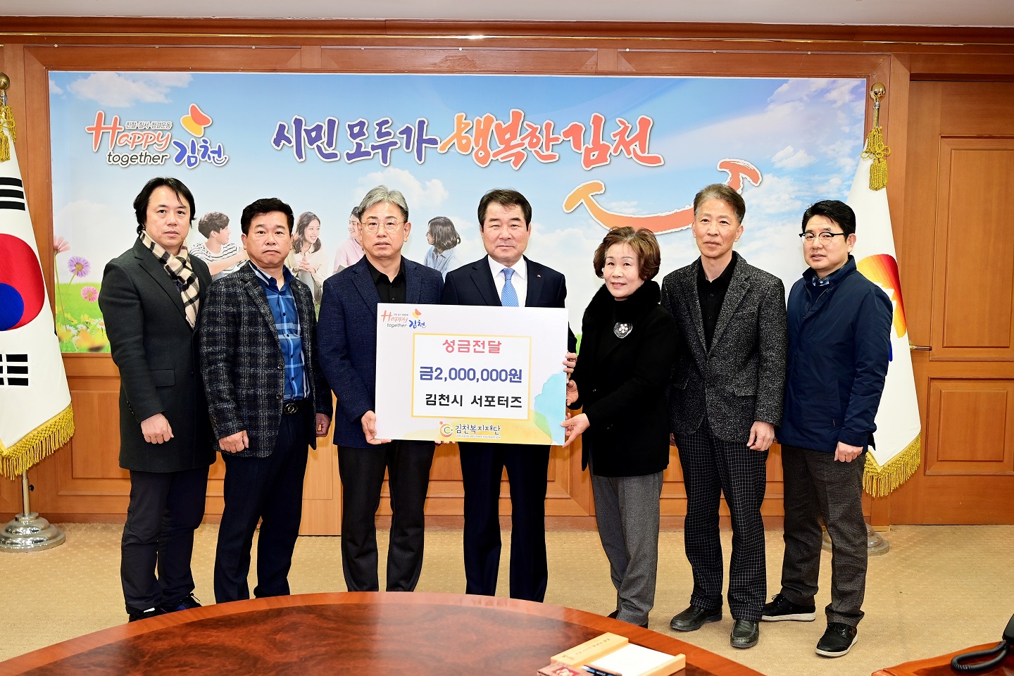 | 김천시 서포터즈(회장 이만수)는 지난 2월 20일 관내 어려운 이웃에게 전달해 달라며 김천복지재단에 자체 모금한 이웃돕기성금 200만원을 전달했다.