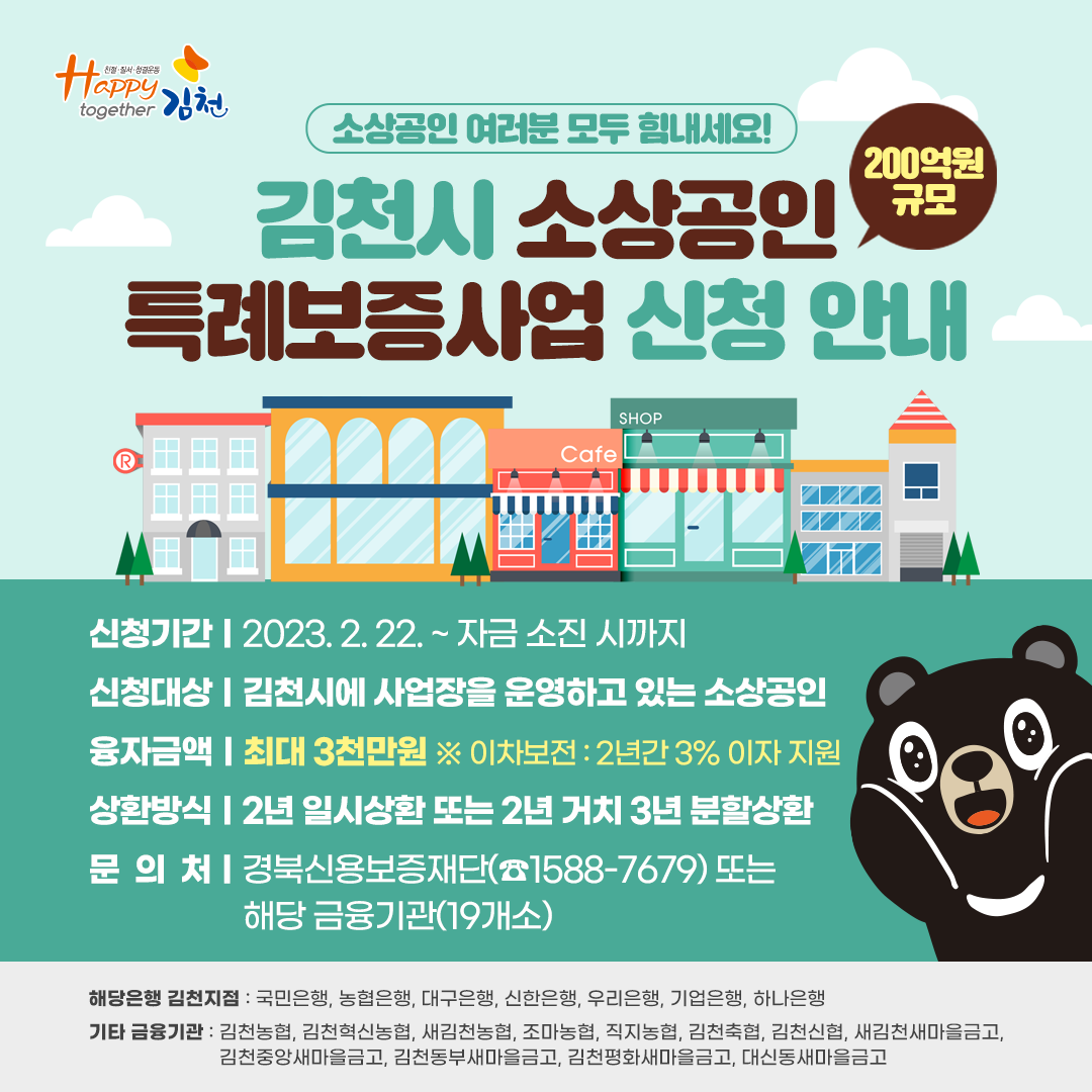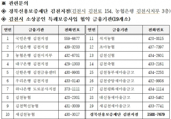 시는 보증규모 200억원에 해당하는 20억원을 경북신용보증재단에 출연해 담보 능력이 부족한 소상공인이 금융기관으로부터 저금리로 대출을 받을 수 있도록 하고, 급격한 대출금리 상승으로 부담이 커진 소상공인을 위해 2년간 연3%의 이자를 지원한다. 지원대상은 김천시 관내 사업장을 둔 소상공인으로 1인당 최대 3천만원까지 신청 가능하며, 경북신용보증재단 김천지점을 방문해 개인신용평점, 대출 연체, 국세‧지방세 체납 등 결격사유와 보증 가능여부 확인 후 관내 19개 금융기관에서 대출을 받을 수 있다.