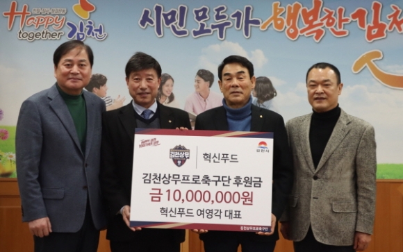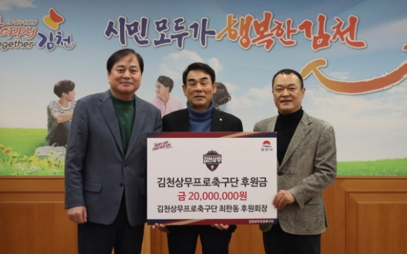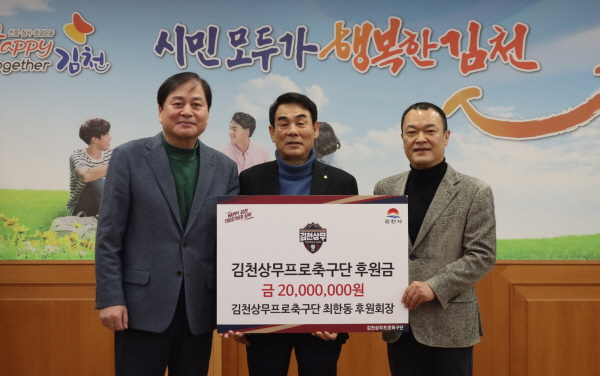 |  | | | ⓒ 김천내일신문 | | 김천상무프로축구단이 지난2월21일 김천시청 2층 접견실에서 최한동 후원회장, 여영각 혁신푸드 대표의 후원금 전달식을 가졌다. 최한동 후원회장은 2,000만원을, 여영각 혁신푸드 대표는 1,000만원을 전달했다. 이날 행사에는 김천상무 배낙호 대표이사, 이재하 단장이 참석했다.