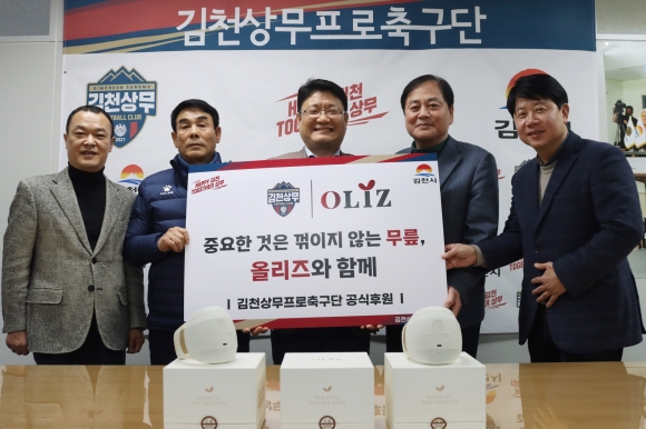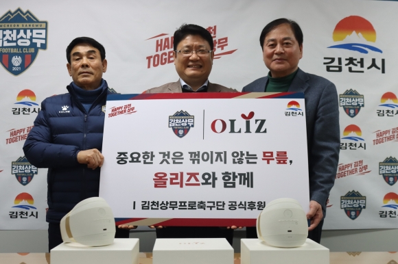 김천상무프로축구단이 2월 21일 김천상무 대표이사실에서 무릎통증 완화 의료기기 ‘올리즈’ 유통사인 ㈜윈우파트너스와 광고 후원 협약식을 진행했다. 앞서 ㈜윈우파트너스는 김천상무에 7천만원 상당의 무릎통증 완화 의료기기를 구단에 후원했다.