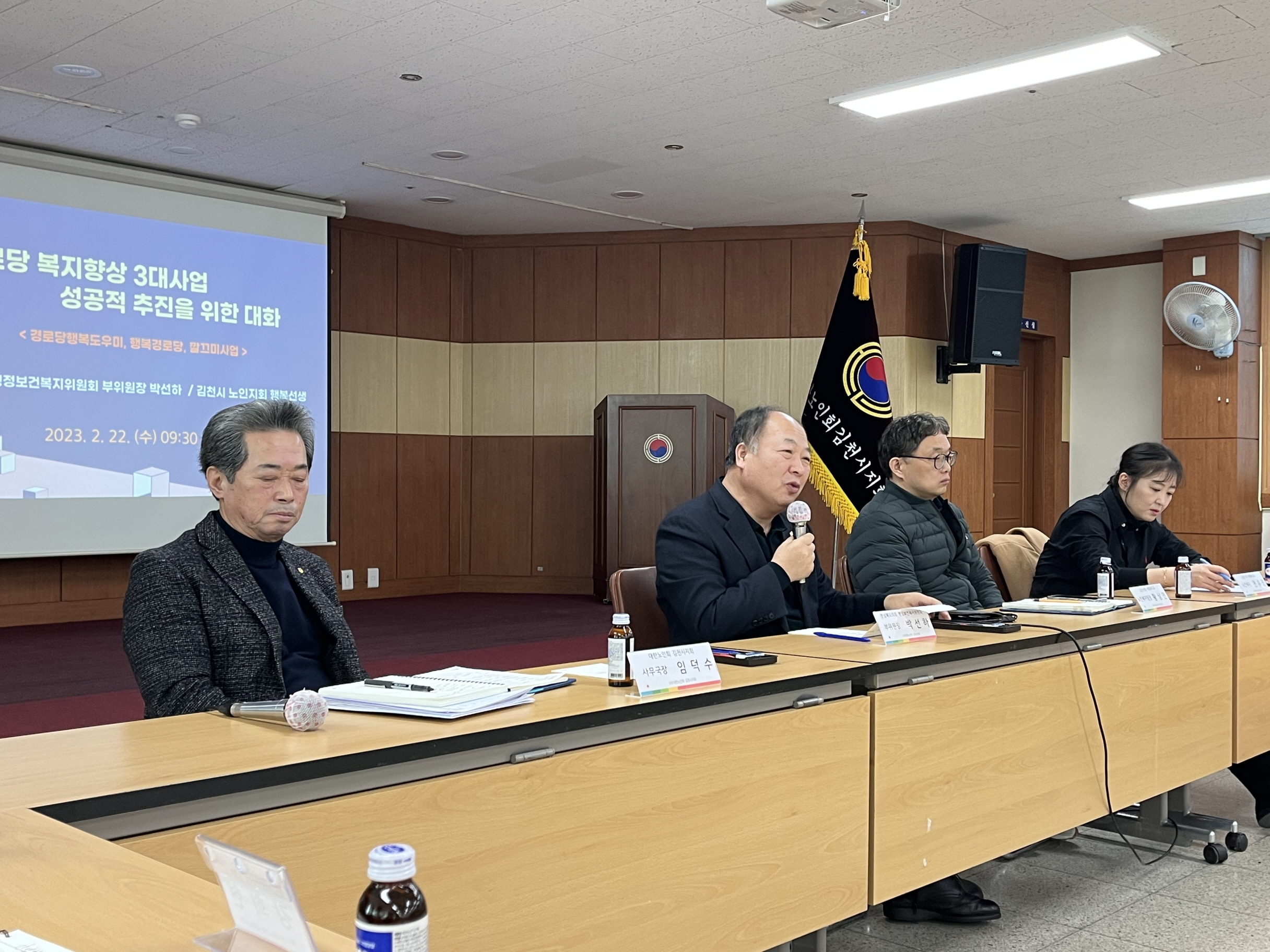 | 대한노인회김천시지회 (회장 이부화) “경로당행복 선생님” 35명은 지난 2023년 2월 22일 지회 2층 대회의실에서 박선하 경상북도의원 (행정 보건복지위원회 부위원장)을 초청하여, 김천시 사회복지과 황상연 노인복지팀장과 관계공무원이 참석한 가운데 경로당행복도우미 사업 활성화를 위한 간담회를 가졌다 한편 경로당행복도우미 사업은 경로당을 중심으로 행복선생님들이 지역 어르신들의 건강, 교육, 복지 등 맞춤서비스를 제공하여 어르신들에게 실질적으로 도움을 주어 경로당 활성화와 어르신 복지증진을 높이고자 하는 사업으로 2019년부터 시행하고 있다