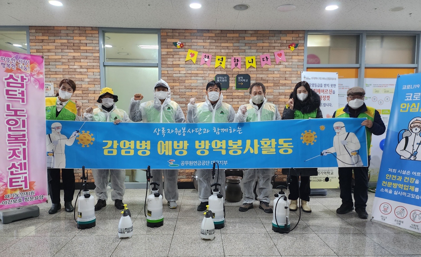 | 공무원연금공단(이사장 황서종, 이하 ‘공단’) 대구지부는 2월 22일 대구 중구에 위치한 삼덕노인복지센터에서 안전한 지역사회를 위한 방역 봉사를 실시했다.
