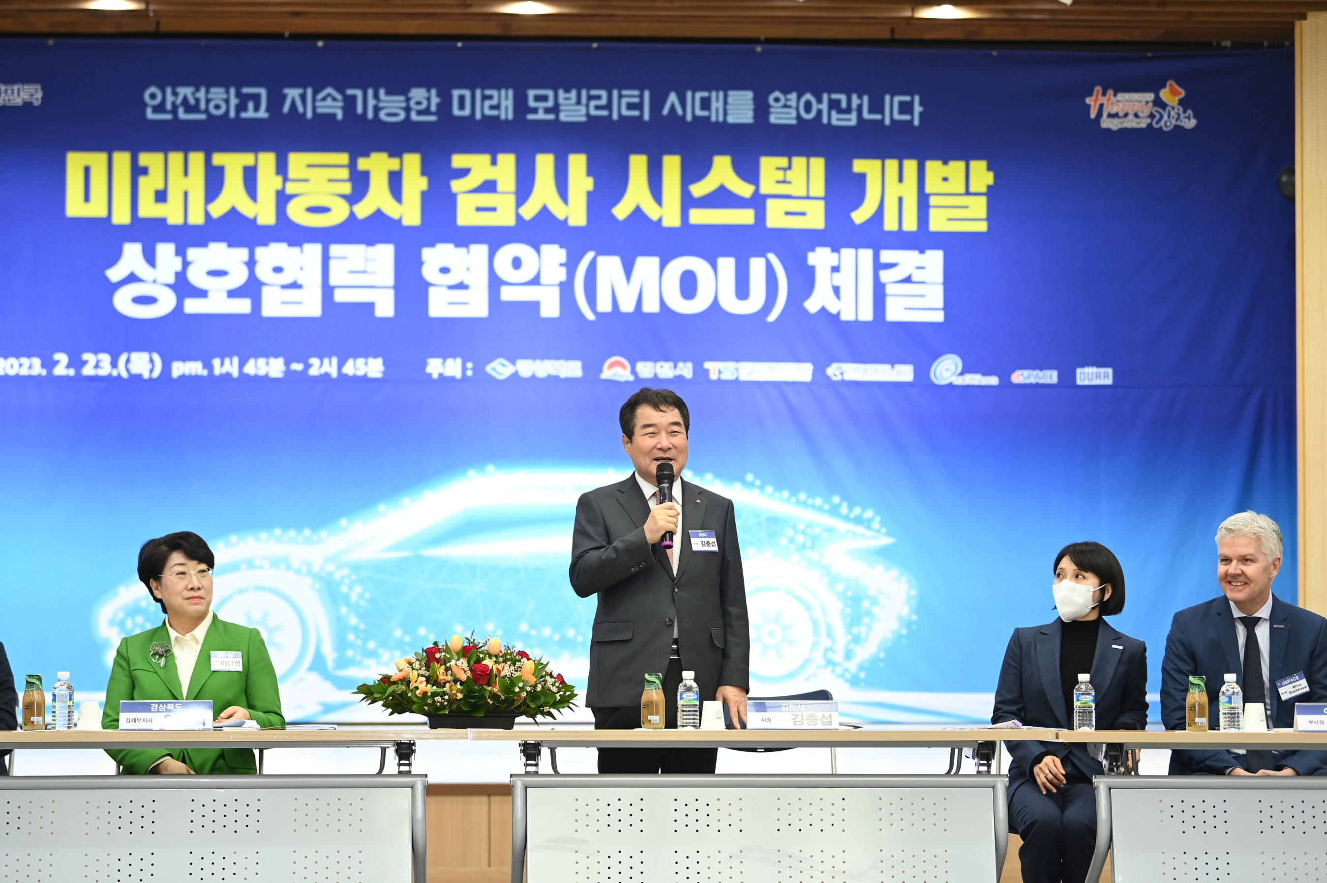| 김천시(시장 김충섭)는 지난 2월 23일(목) 본청 대강당에서 경북도청, 한국교통안전공단, (재)경북테크노파크, 독일 Dürr Assembly Products社(이하 DAP), dSPACE社, 그리고 지역 우수기업인 계양정밀 등 7개 기관이 참석한 가운데 ‘미래첨단자동차 검사시스템 개발’에 관한 업무협약(MOU)식을 개최했다.