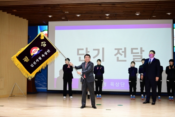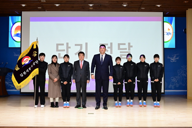 김충섭 김천시장은 “전국 최고 수준의 스포츠 인프라를 바탕으로 송정헌 단장을 비롯한 유능한 지도자들 아래에서 체계적인 훈련과 부단한 노력으로 각종 대회에서 갈고 닦은 기량을 발휘하여 스포츠중심도시로서 자리매김중인 14만 김천시민들의 기대에 부흥하여 주길 바란다.”고 전했다. |  | | | ⓒ 김천내일신문 | |