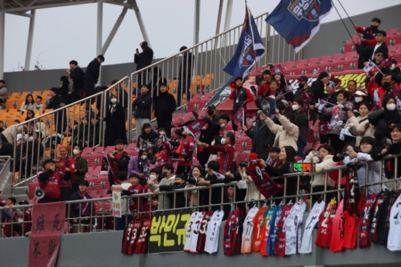 김천상무프로축구단이 지난3월4일 청주종합경기장에서 열린 ‘하나원큐 K리그2 2023’ 2R 충북청주FC와 원정경기에서 이영재, 김지현의 연속골로 2대 0 승리를 거뒀다. 이날 경기에는 김천상무 공식 서포터즈 ‘수사불패’, 김천시 서포터즈를 비롯해 팬 약 200여 명이 경기장을 찾아 김천의 승리를 응원했다.