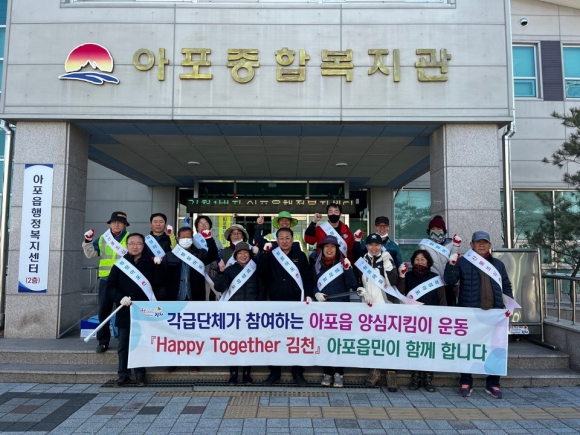 『Happy together김천』 아포읍 실천과제 중 하나인 『양심지킴이 운동』은 불법쓰레기·불법광고물 근절과 깨끗한 환경의 살기 좋은 아포읍을 만들기 위해 올해부터 추진하고 있으며, 각급 단체장의 자발적인 솔선수범 덕분에 순조롭게 진행되고 있다.