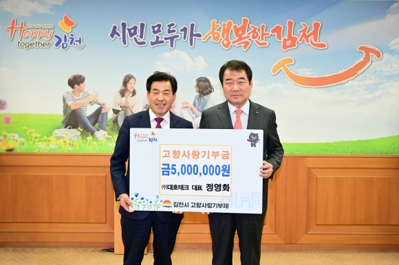 | 김천시는 ㈜대호테크 정영화 대표가 3월 3일 김천시청을 방문하여 고향사랑기부금 500만원을 기탁했다고 전했다.