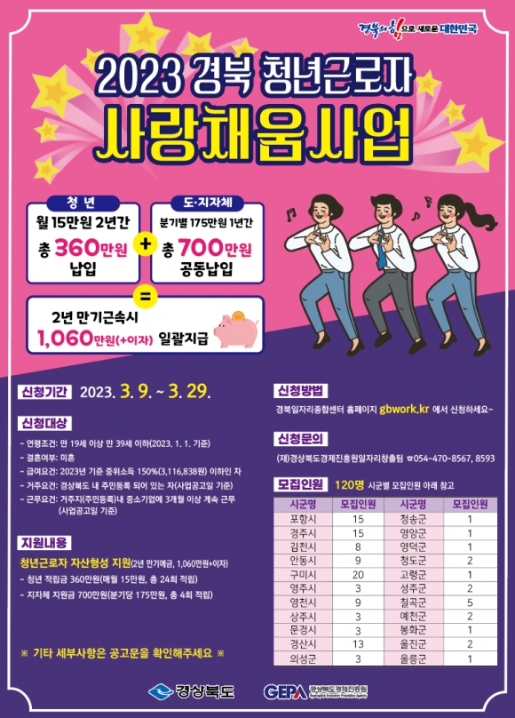 청년근로자 사랑채움사업은 청년근로자가 2년간 월 15만원씩(총 360만원) 저축하면 경북도와 시군이 공동으로 1년 간 분기별 175만원씩(총 700만원) 추가 적립해 최종 만기 시 1060만원과 이자를 지급하는 경북형 미혼 청년근로자 결혼자금 지원 사업이다.