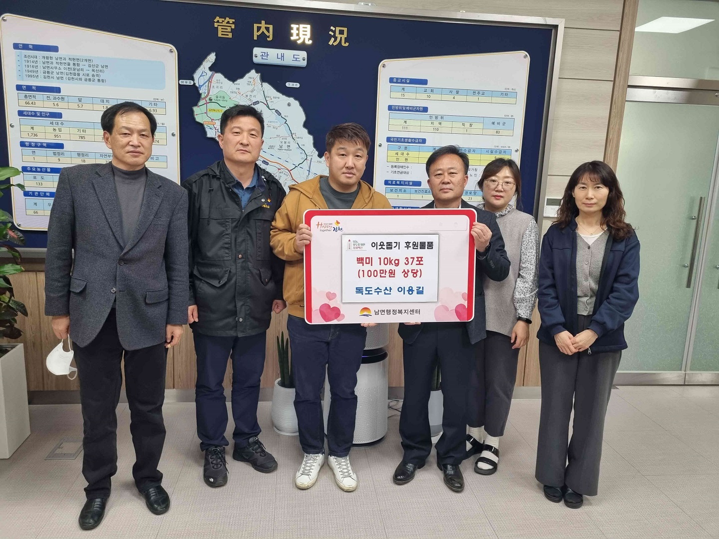 | 지난 3월 10일(금) 이용길 독도수산 대표는 면행정복지센터를 직접 방문하여 저소득 소외계층을 위한 쌀10kg 37포(100만원 상당)을 기탁했다.