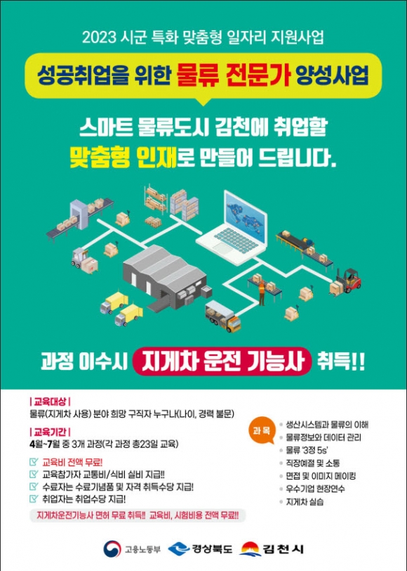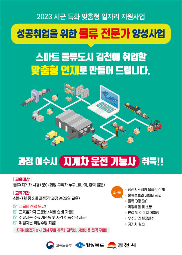| 김천상공회의소(회장 안용우)는 지난해에 이어 스마트물류 거점도시로 거듭나고 있는 지역 산업의 특성에 맞는 인재를 양성하여 일자리를 찾아주는 「시군 특화 맞춤형 일자리 지원사업」을 진행한다.