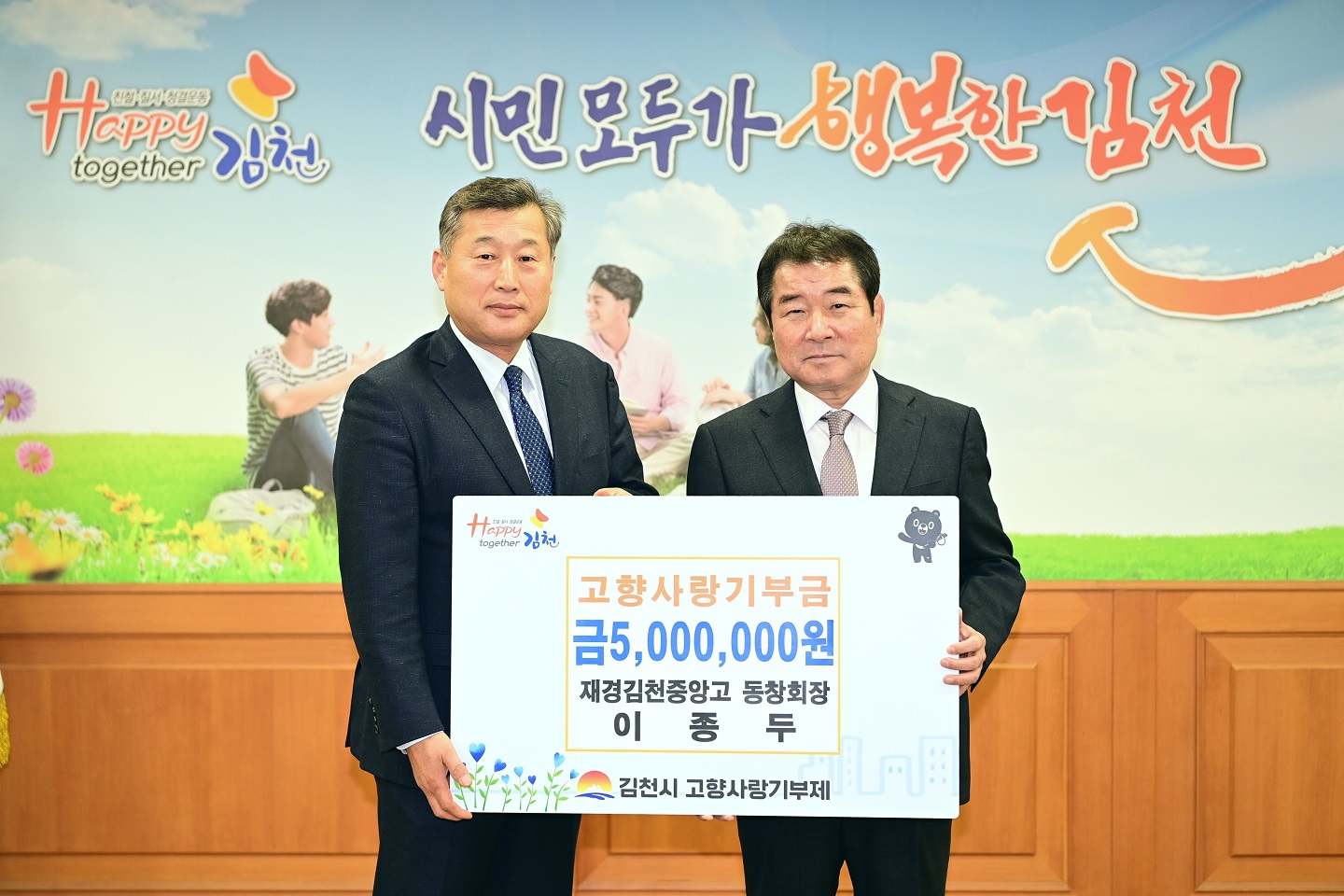 지난 1월 김현태 회장의 500만원 기탁에 이어, 3월 13일 백인숙 여성회장과 이종두 부회장(재경김천중앙고동창회장)이 기부금 최고한도액 5백만원을 각각 기탁했다.