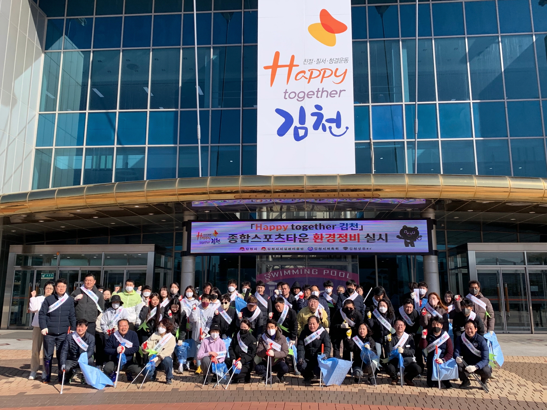 이날 활동은 시설관리공단 외 4개의 유관부서(스포츠산업과, 김천시체육회, 문화예술회관, 김천상무FC사무국)와 합동으로 진행되었으며, 실내수영장과 국민체육센터를 비롯한 종합스포츠타운 일대의 쓰레기를 수거하고 정리하였다.