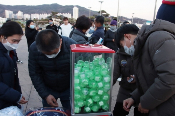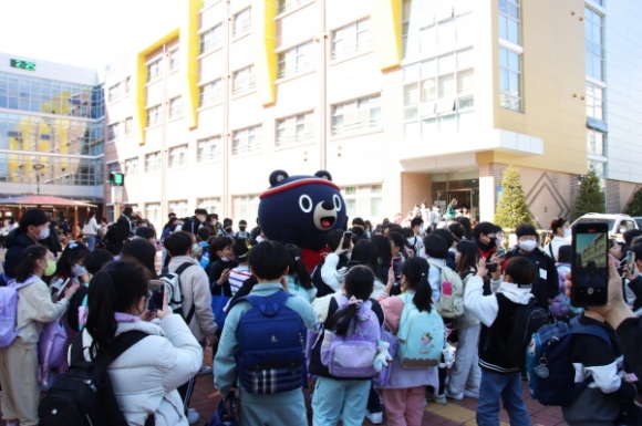 3월 14일에는 김천 운곡초등학교, 율곡초등학교를 찾아 하굣길 초등학생들을 맞았다. 운곡초 1,2학년 및 율곡초 3~6학년을 대상으로 ‘슈웅이와 함께 돌려보슈웅’ 이벤트를 진행했다. 김천시 내 초등학교 중 가장 많은 학생 수를 자랑하는 율곡초, 운곡초답게 학생들의 관심 또한 상당했다. 특히 율곡초는 약 300여 명의 학생들이 참가하며 예정된 시간보다 40분 추가 진행했다. 마스코트 슈웅이 또한 인기 만점이었다. |  | | | ⓒ 김천내일신문 | |