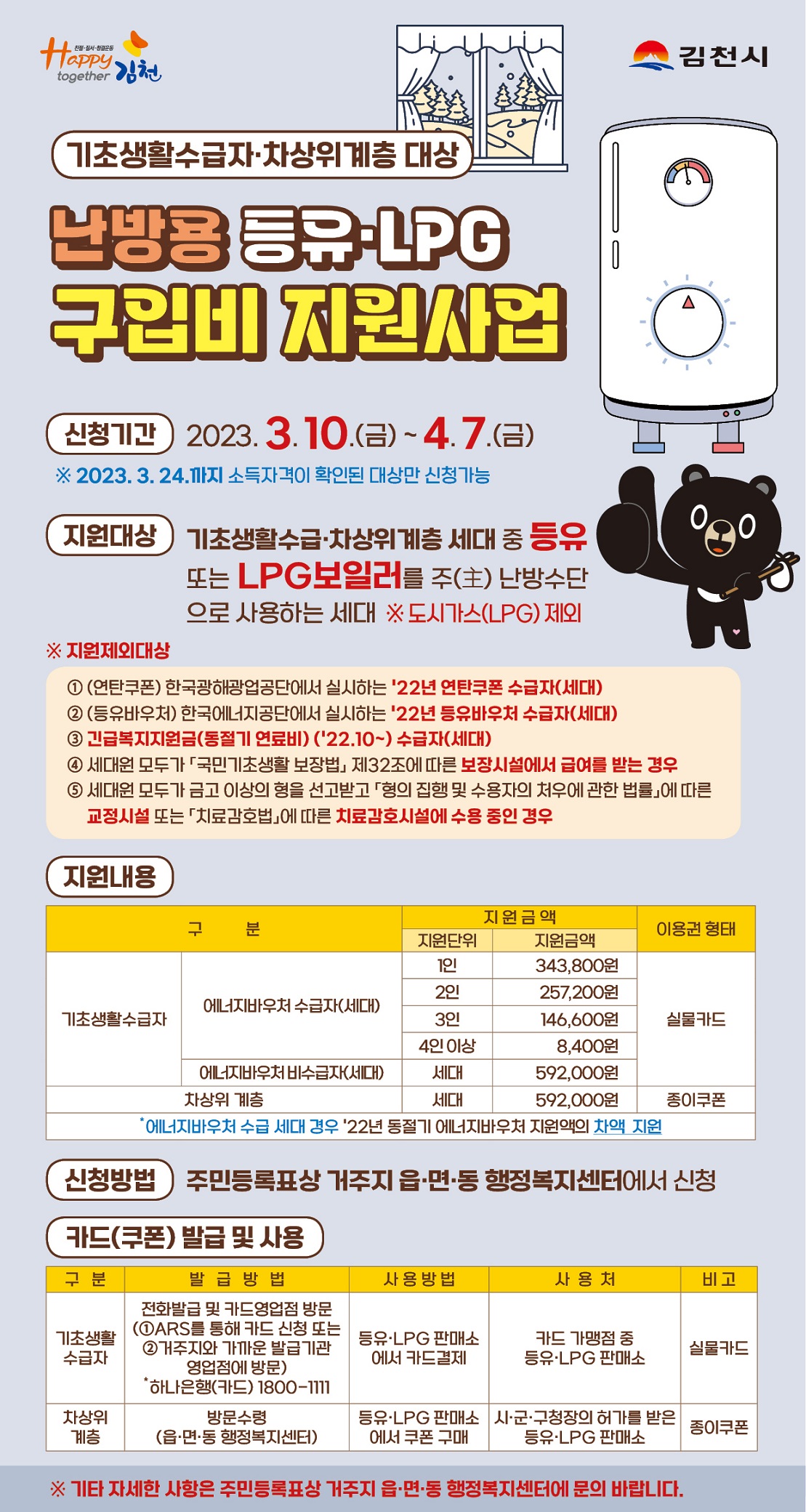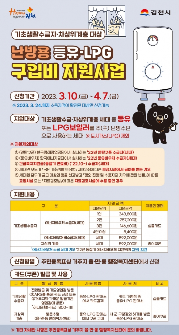 신청은 주거지 관할 행정복지센터에 신청서를 작성해 제출하면 된다. 직접 신청이 어려우면 이장, 통장, 사회복지사 등을 대리인으로 선임하면 대리 신청도 가능하다.지원 대상으로 선정되면 카드사(하나카드 1800-1111)에 전용 카드를 신청해 발급(기초생활수급자)받거나, 행정복지센터에서 종이 쿠폰을 수령(차상위계층)해 오는 6월 30일까지 난방용 등유·LPG 구매 시 현금 대신 사용하면 된다.