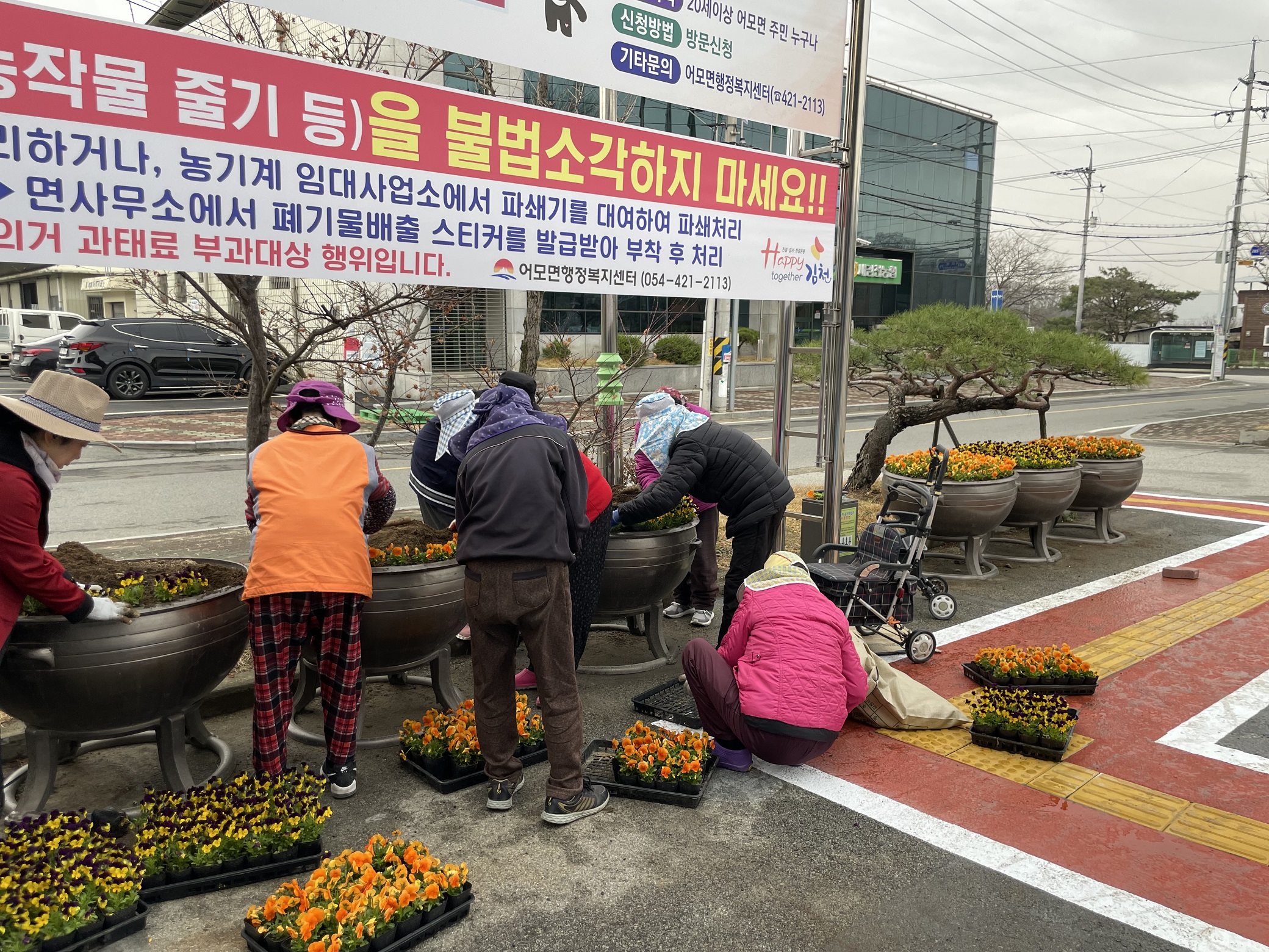 이번 봄꽃 심기는 Happy together 김천 청결 운동의 하나로 어모치안센터, 새김천농협, 어모면 행정복지센터 등 주민들의 왕래가 잦은 다중이용시설을 중심으로 비올라 2,000본을 심는 작업이 진행되었다.