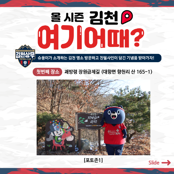 |  | | | ⓒ 김천내일신문 | | 김천상무프로축구단이 3월26일부터 ‘김천 여기어때’ 이벤트를 진행한다는 계획이다. ‘김천 여기어때’ 이벤트는 김천상무 마스코트 슈웅 활용 관광명소 방문 인증 이벤트이다. 매 홈경기 7일 전 김천상무 공식 인스타그램에 업로드 되는 관광명소를 방문해 마스코트 슈웅이와 동일한 포즈로 인증 샷을 찍은 후 개인 인스타그램 계정에 #김천상무_여기어때 해시태그를 포함해 업로드하면 참여가 완료된다고 밝혔다.