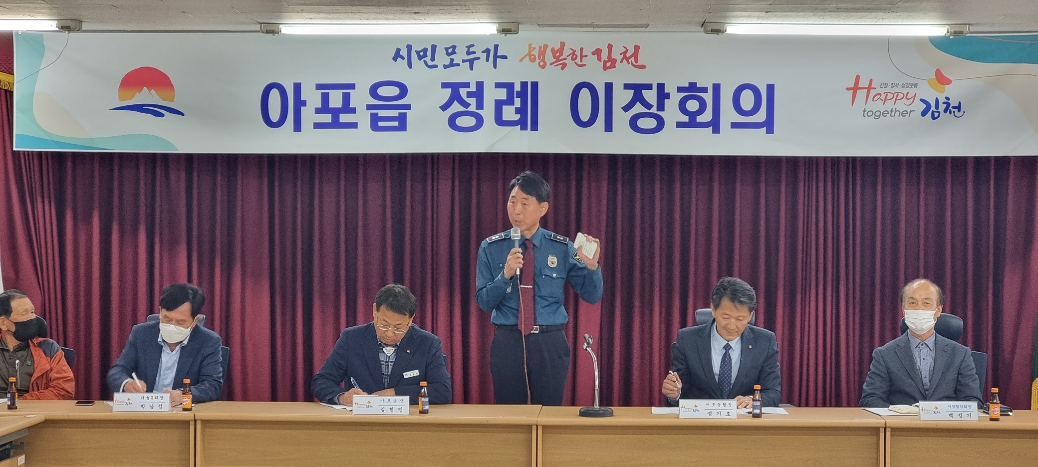 또한 Happy together 김천 운동의 일환으로 『읍민의 다양한 의견을 듣는 ‘아포읍 듣는 우체통’』으로 접수된 ▲대신리 ~ 혁신도시 간 속도제한 상향 ▲역전사거리 비보호 좌회전 추가 등 의견을 전달했다. 백성기 이장협의회장은 “읍 발전을 위한 소중한 의견을 김천경찰서에 전달하게 되어 기쁘다.”며 “향후 각 기관에서 정기적인 교육을 추진하여 읍 발전에 보탬이 되었으면 좋겠다.”라고 전했다.