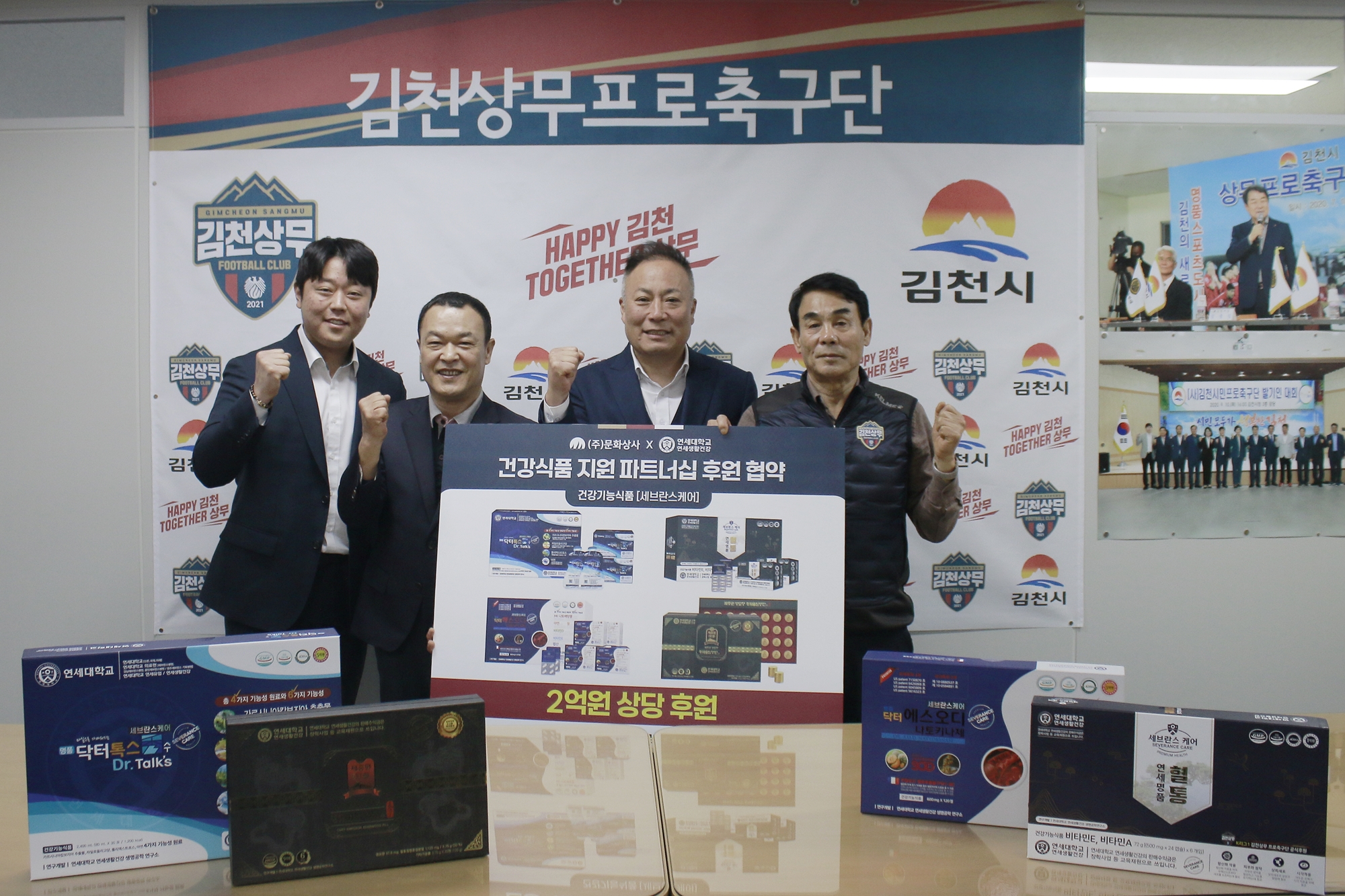 | ㈜문화상사가 2023시즌 김천상무 선수단에게 2억원 상당의 건강기능식품 세브란스케어를 후원한다.