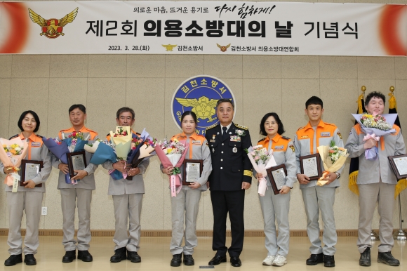 | 김천소방서(서장 전우현)는 3월 28일 김천소방서 2층 대회의실에서 의로운 마음, 뜨거운 용기로 다시 힘차게! 라는 슬로건으로 제2회 ‘의용소방대의 날’ 기념행사와 유공 의용소방대원에 대한 표창을 수여했다고 밝혔다.