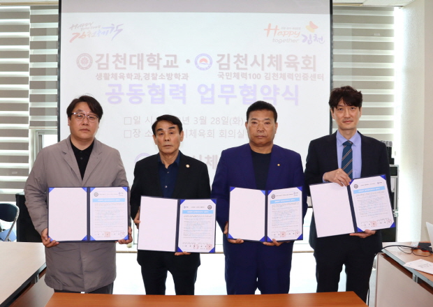 |  | | | ⓒ 김천내일신문 | | 김천대학교(총장 윤옥현) 생활체육학과(주임교수 홍상민)와 경찰소방학과(주임교수 김봉수)는 김천시 체육회(회장 최한동)와 김천시의 체육 발전과 양기관의 상호발전을 위한 업무협약을 체결하였다고 밝혔다. 대한민국 스포츠 중심도시 김천(시장 김충섭)은 전국 최고의 스포츠시설 인프라와 활발한 마케팅을 발판으로 다양한 스포츠 이벤트를 개최하고 있으며, 시민들을 위한 다양한 생활체육 프로그램을 제공하고 있다. 이와 더불어 김천시체육회는 ‘시민과 함께하는 역동의 스포츠 중심도시’라는 비전을 바탕으로 가맹 경기 단체 지원 및 엘리트 체육인 육성 사업 등을 통해 지역 체육 발전과 건강한 시민 사회 조성에 큰 공헌을 하고 있다.