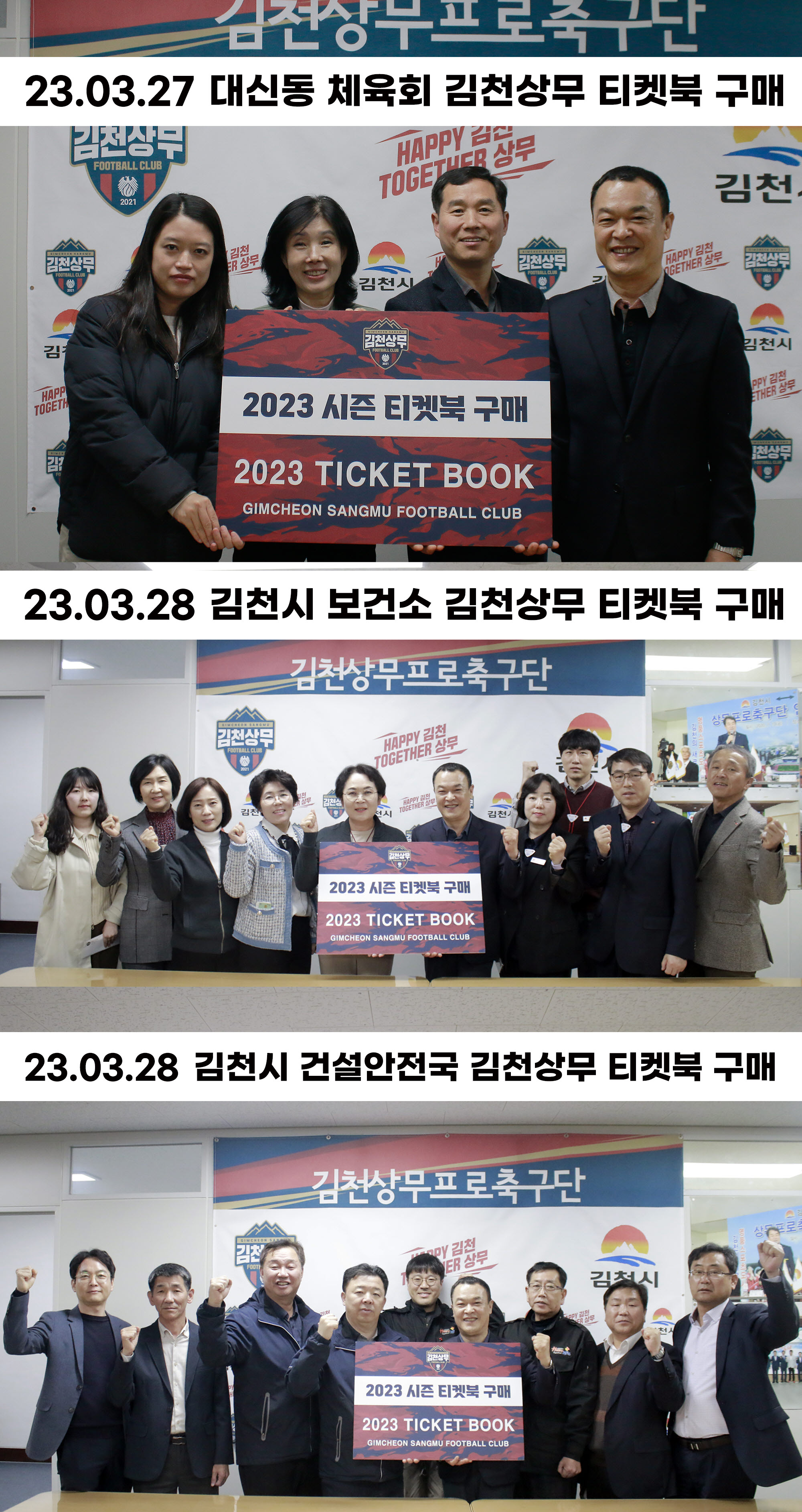 김천상무프로축구단이 3월 27일 김천상무 대표이사실에서 대신동 체육회의 티켓북 구매 릴레이 행사를 진행했다. 행사에는 김천상무 이재하 단장, 대신동 체육회 김진숙 감사, 김도철 재무국장, 이지선 담당자가 참석했다. 대신동 체육회는 티켓북 10권을 구매했다.