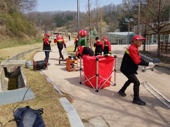 | 김천시는 최근 건조한 날씨와 강풍 등으로 전국적으로 산불위험이 커짐에 따라 3월 29일~30일(2일간) 친환경 생태공원 및 김천종합스포츠타운 주차장에서 산림녹지과 직원, 산불 전문 예방진화대원 등이 참여한 가운데 산불 현장 통합지휘 본부 운영 및 산불 진화 기계화시스템(중형펌프) 훈련을 실시했다.