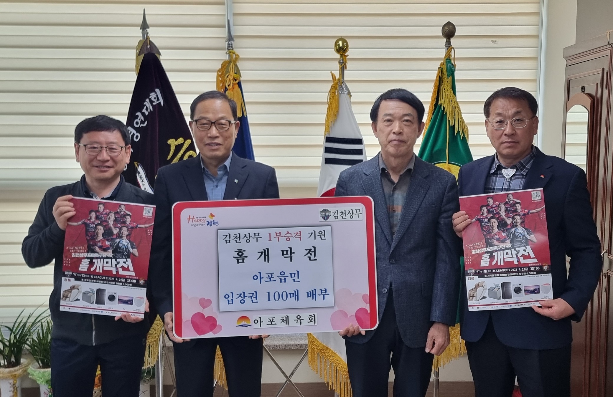 | 김천시 아포체육회(회장 유청술)는 김천 상무의 1부 승격 기원과 4월 2일 일요일 13시 30분 홈 개막전 홍보를 위해서 아포읍민에게 김천 상무 홈 개막전 입장권 100매를 선착순(1인 1매)으로 배부한다고 밝혔다.