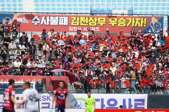 김천상무 공식 서포터즈 ‘수사불패’, 김천시 서포터즈 등 팬 5,964명이 운집하며 김천상무의 홈 개막전에 대한 뜨거운 열기를 증명했다. 가변석은 전 좌석이 매진됐다.