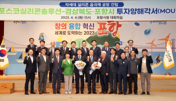 경북도와 포항시는 4월 4일 포항시청 대회의실에서 이달희 경북도 경제부지사, 김남일 포항부시장, 유병옥 포스코홀딩스 부사장, 이재우 포스코실리콘솔루션 대표이사, 박용선 경북도의회 부의장, 백인규 포항시의회 의장을 비롯해 김상우 포스텍 산학협력단장, 김종록 한동대 행정부총장, 김형락 포항대 총장, 강흥식 가속기연구소 소장, 이점식 포항TP원장 등 산학연 관계자 30여명이 참석한 가운데 포스코실리콘솔루션과 3000억원의 대규모 투자협약을 체결했다.