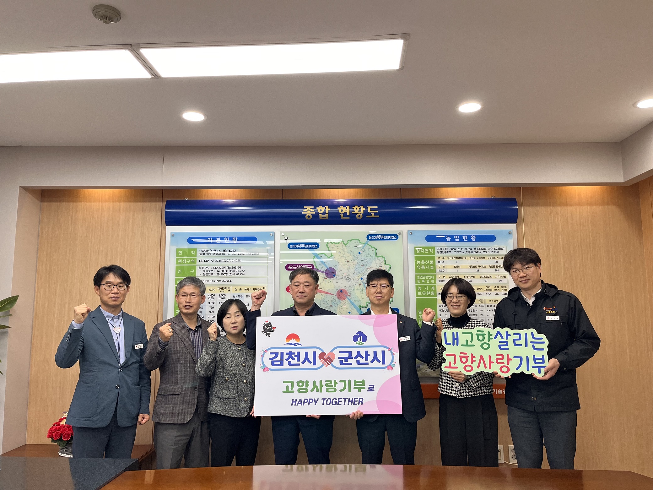 김천시농업기술센터는 4월 5일 자매도시 군산시에 484만원의 고향사랑기부금을 기부했으며, 이에 군산시농업기술센터에서도 자매도시 김천시에 483만원의 고향사랑기부금을 기부했다.
