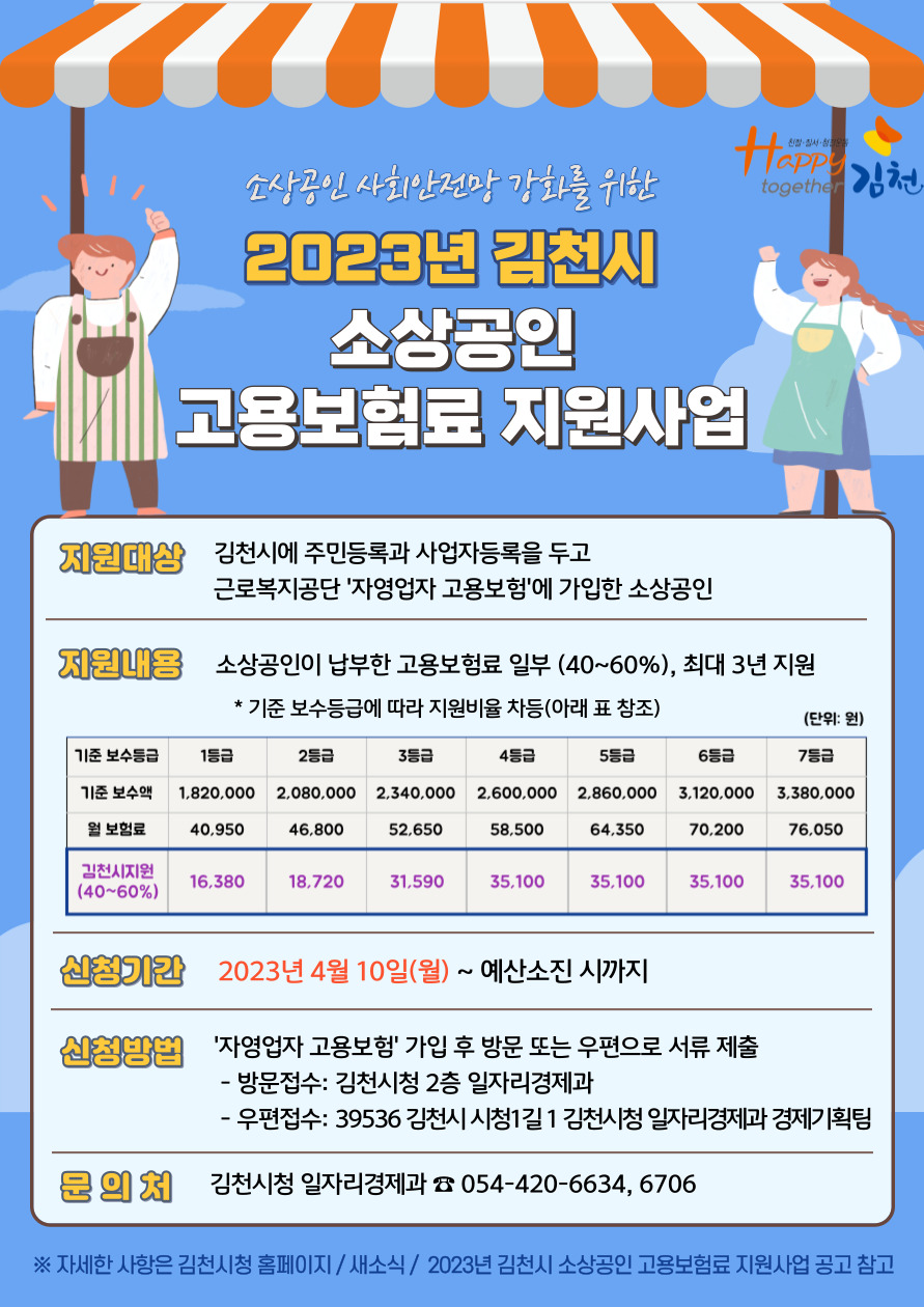| 김천시(시장 김충섭)는 소상공인의 고용보험 가입을 유도하고 폐업 이후의 생활안정 도모 등 사회안전망 확대를 위한 2023년 소상공인 고용보험료 지원사업 접수를 4월 10일부터 시작한다고 밝혔다.