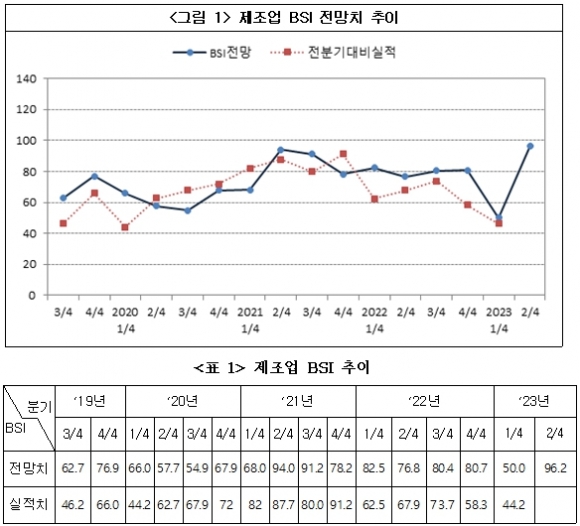 경기전망지수는 100 미만이면 다음 분기 경기가 이번 분기보다 나빠질 것으로 보는 기업이 더 많은 것이고, 100을 넘어서면 그 반대다.