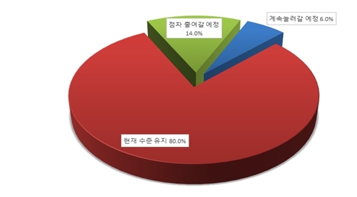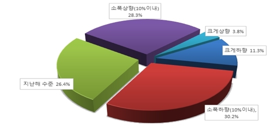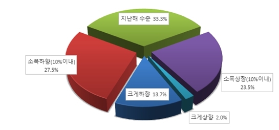 | 영업이익 또한 연초 목표치 대비 ‘소폭하향’(27.5%), ‘크게하향’(13.7%) 될 것이라는 전망이 ‘지난해 수준’(33.3%), ‘소폭상향’(23.5%), ‘크게상향’(2.0%)보다 높은 것으로 나타났다.