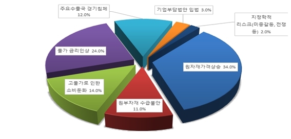 | 2023년 상반기 사업실적에 큰 영향을 미칠 리스크 요인으로 ‘원자재가격 상승’(34.0%), ‘물가·금리인상’(24.0%), ‘고물가로 인한 소비둔화’(14.0%), ‘주요수출국 경기침체’(12.0%), ‘원부자재 수급불안’(11.0%), ‘기업부담법안 입법’(3.0%), ‘지정학적 리스크(미,중 갈등, 전쟁 등)’(2.0%) 순으로 답변했다.