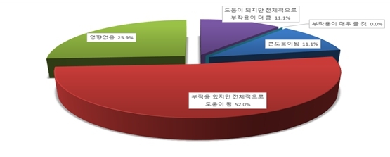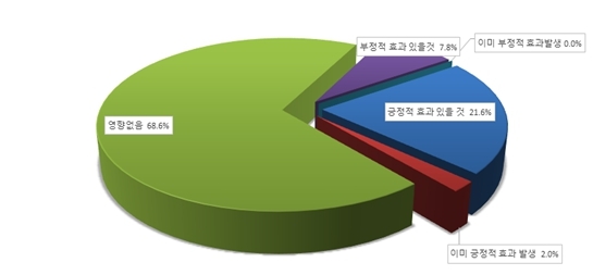 | 조사대상 업체들의 중국 리오프닝이 귀사의 경영실적에 어떤 영향을 미칠 것으로 예상하느냐는 질문에 ‘영향없음’(68.6%)의 답변이 ‘긍정적 효과가 있을것’(21.6%), ‘부정적 효과 있을 것’(7.8%), ‘이미 긍정적 효과 발생’(2.0%) 등의 답변보다 많았다.
